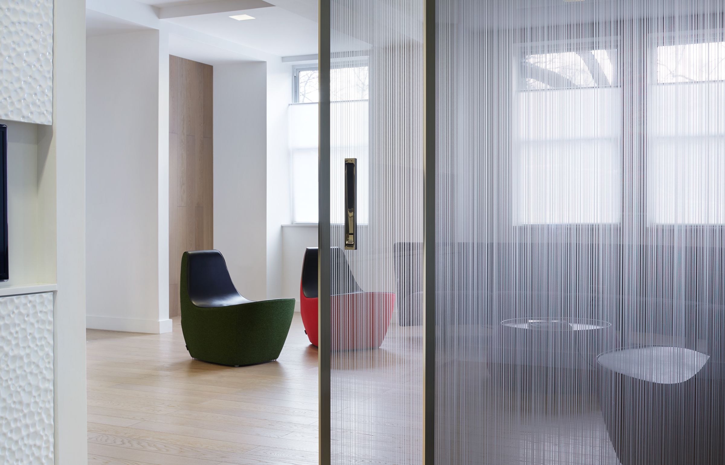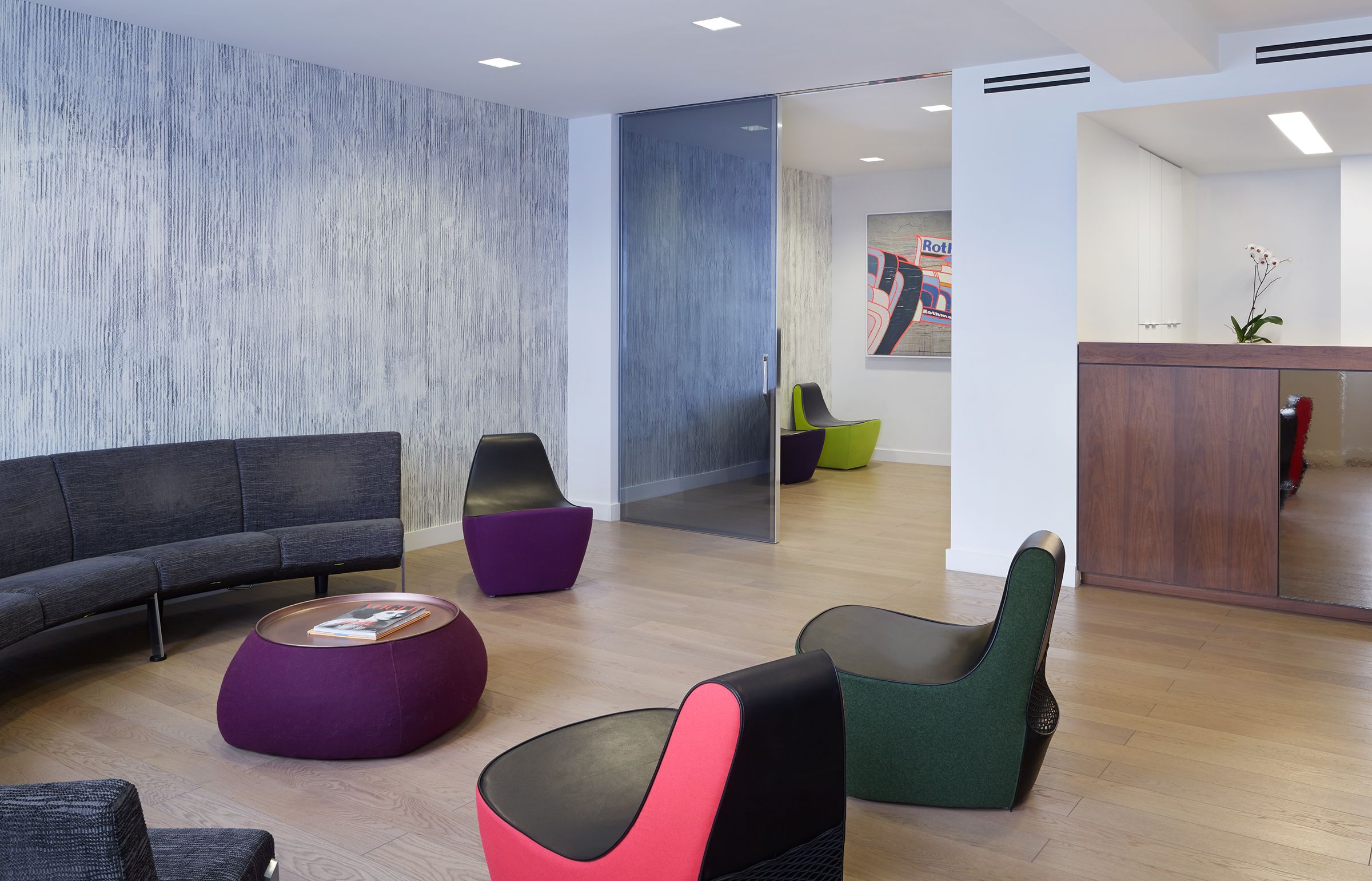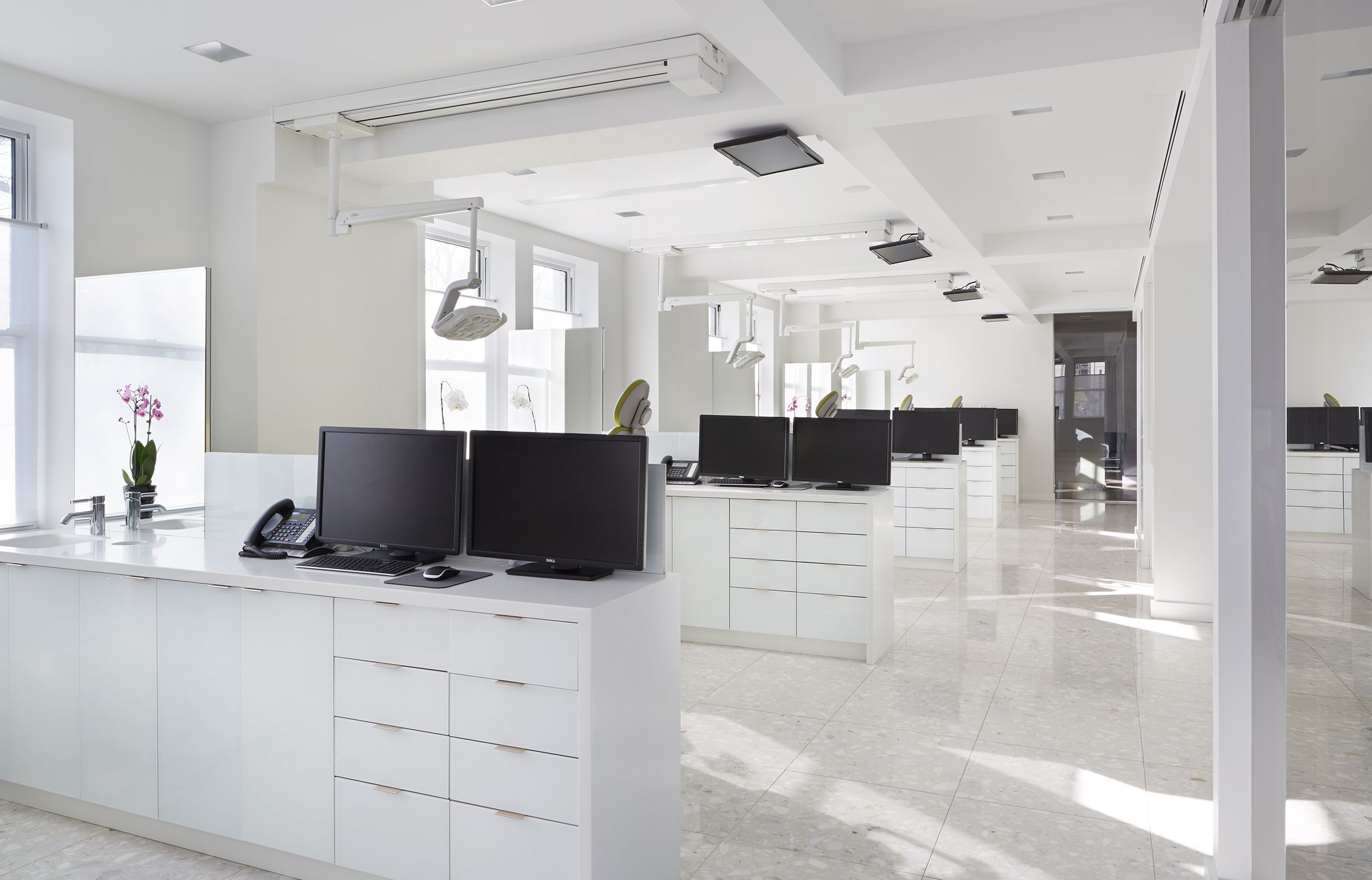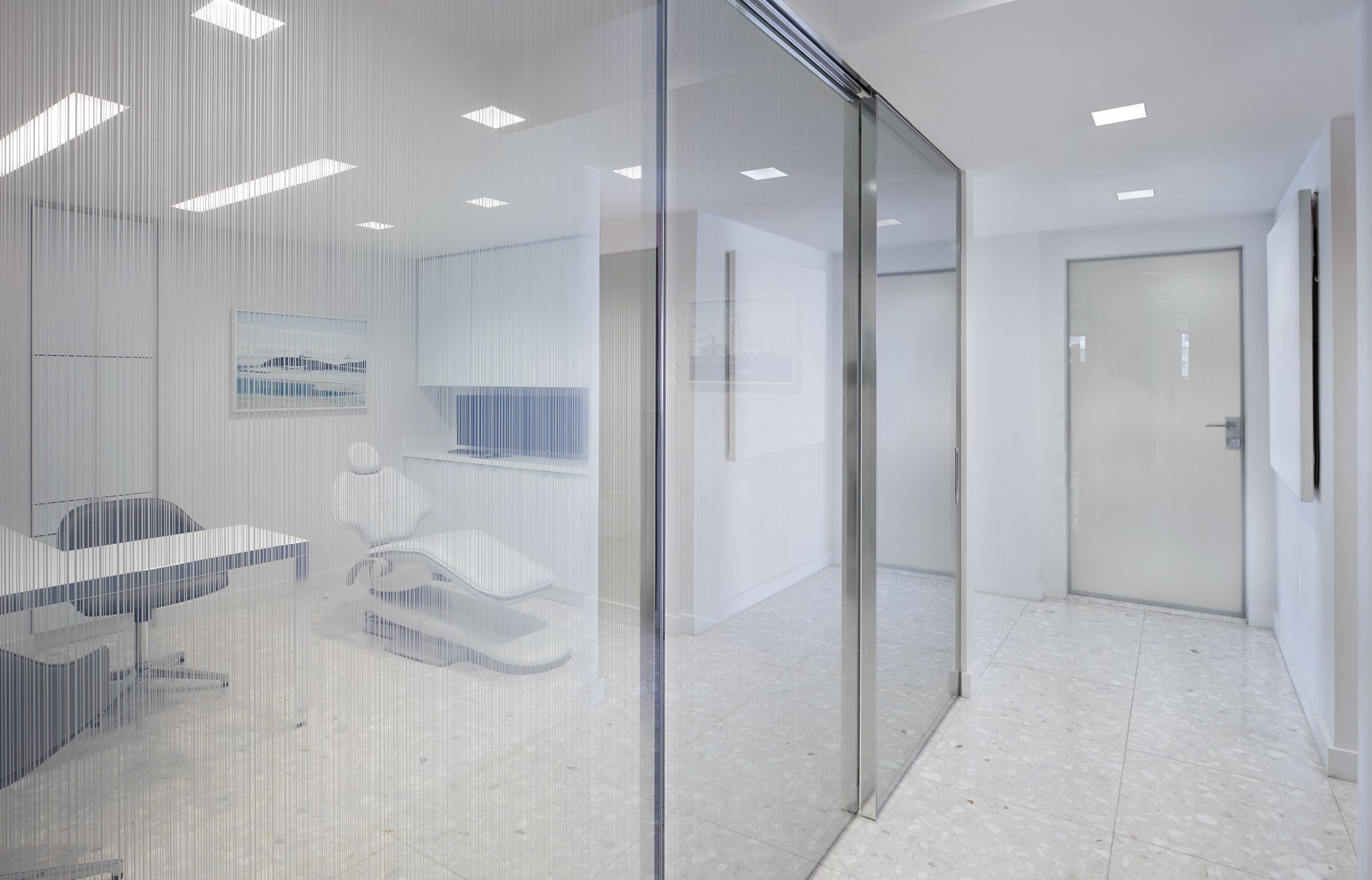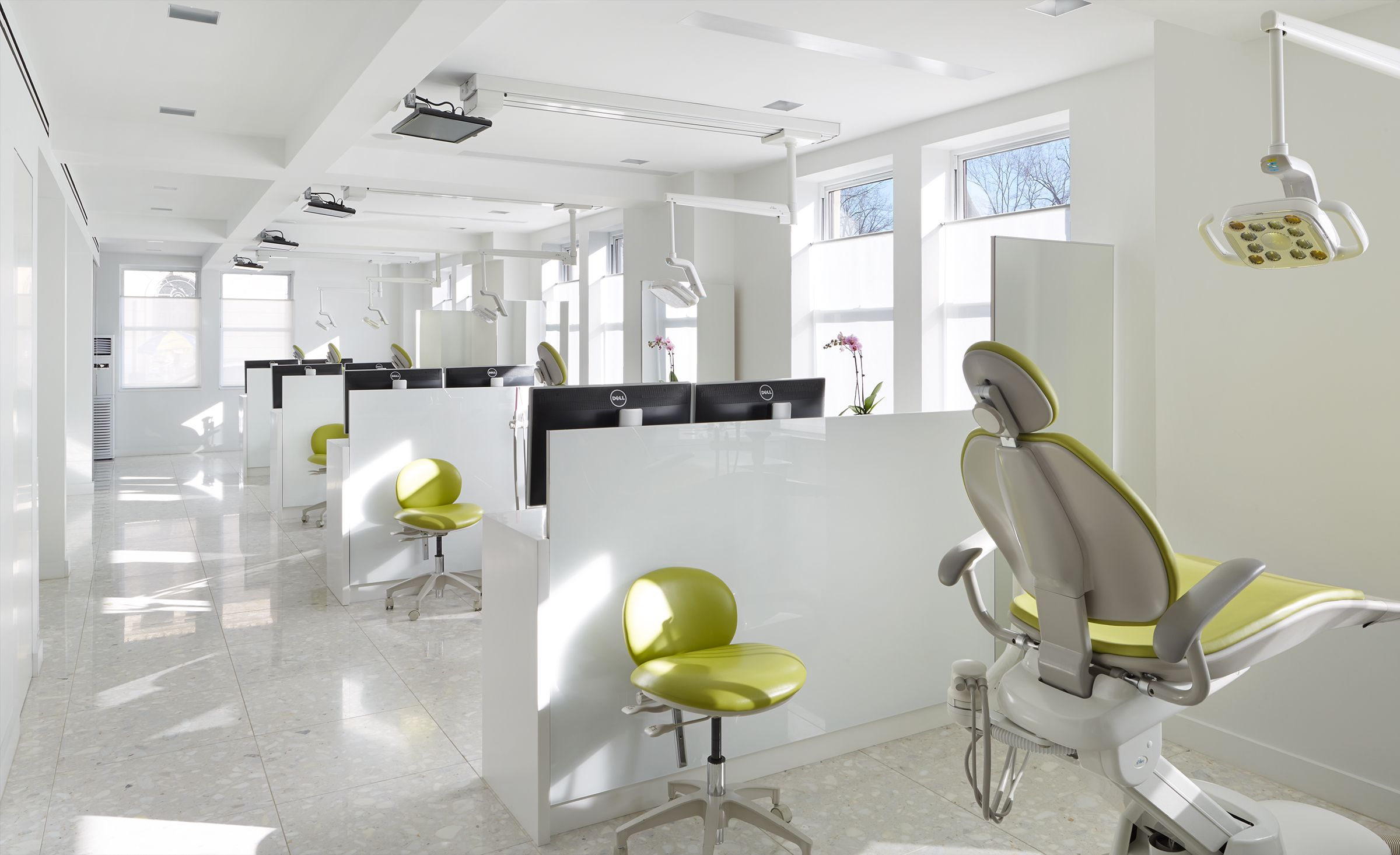 This renovation of a 3,000 sf orthodontic office on Manhattan’s Upper West Side combines abundant natural daylight with cheerful colors and luxury materials. Glass walls and doors separate the lobby from the treatment area. The lobby features a handcrafted plaster wall covering and sculptural, modern furniture. A custom designed reception desks greets clients as they enter the practice. The treatment area features terrazzo tile floors, bright lighting, and ceiling mounted televisions. Private treatment rooms and offices were designed with decorative glass walls that provide privacy, yet maintain a sense of openness.