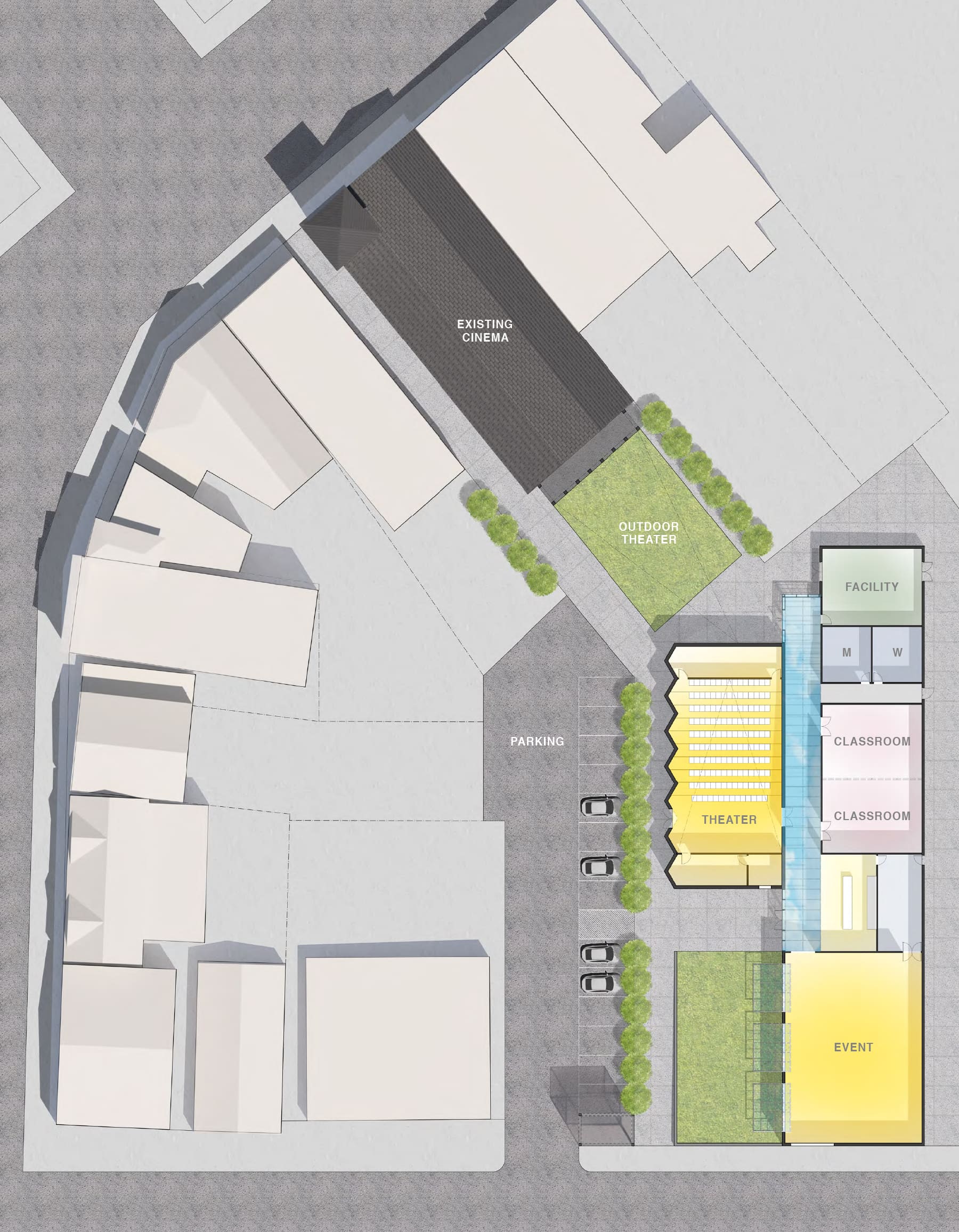 This design proposal was conceived as the basis for a feasibility study. The project envisioned a new free-standing cinema arts complex to supplement an existing multi-screen art house movie theater. The new campus plan concept included public spaces for free outdoor screenings and for community oriented events, a new state of the art theater for cinema and live presentations, an indoor event space that could be used for Cinema Center related functions or as an income generating space, classrooms, an animation studio, as well as administrative offices and support spaces.