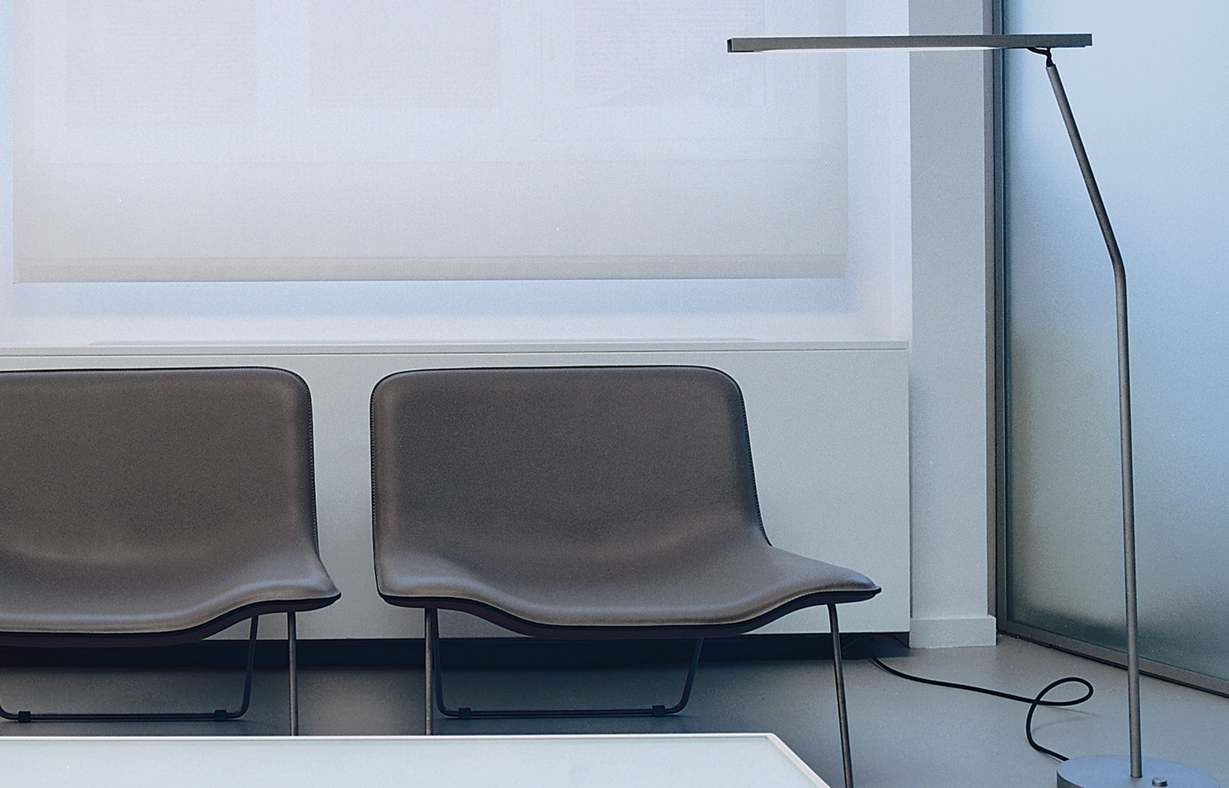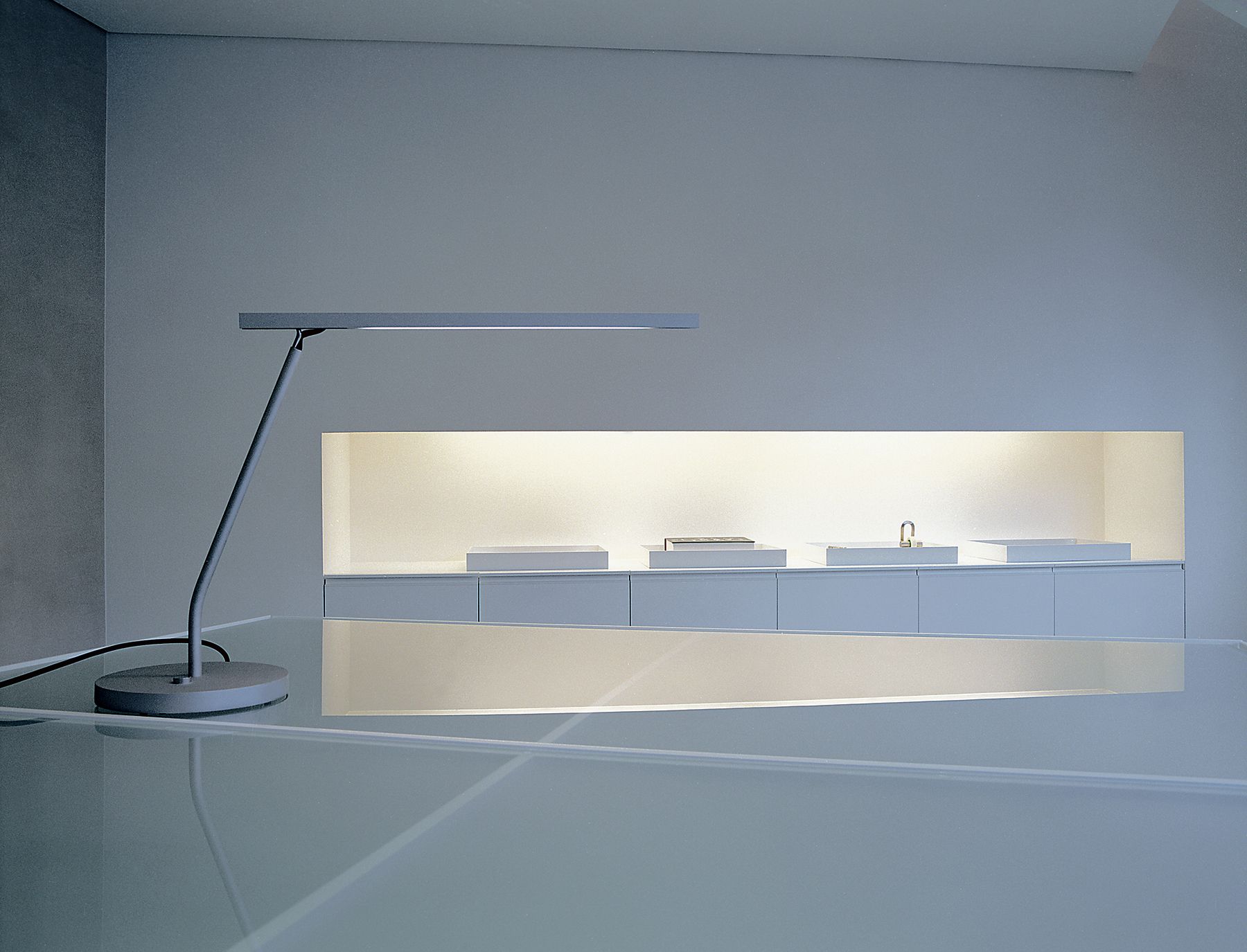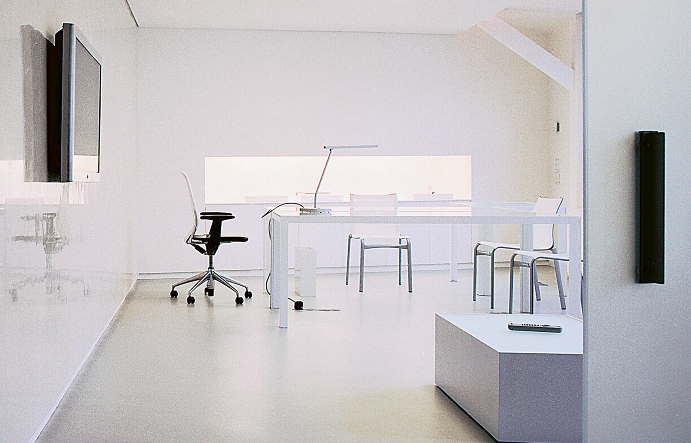 This Parisian office suite, created for the chief executive of the French beauty and fragrance company Coty Inc., is a study in minimalism, taking the inspiration for its spare design from the crystal glass of the company’s fragrance bottles. The sole components of the office are an executive desk-cum-conference table and a small seating area. Brilliant-white Venetian plaster covers the walls, while white high-tech automotive paint finishes the steel furniture. All the glass used — from the conference table to the walls — is crystal clear and low iron.