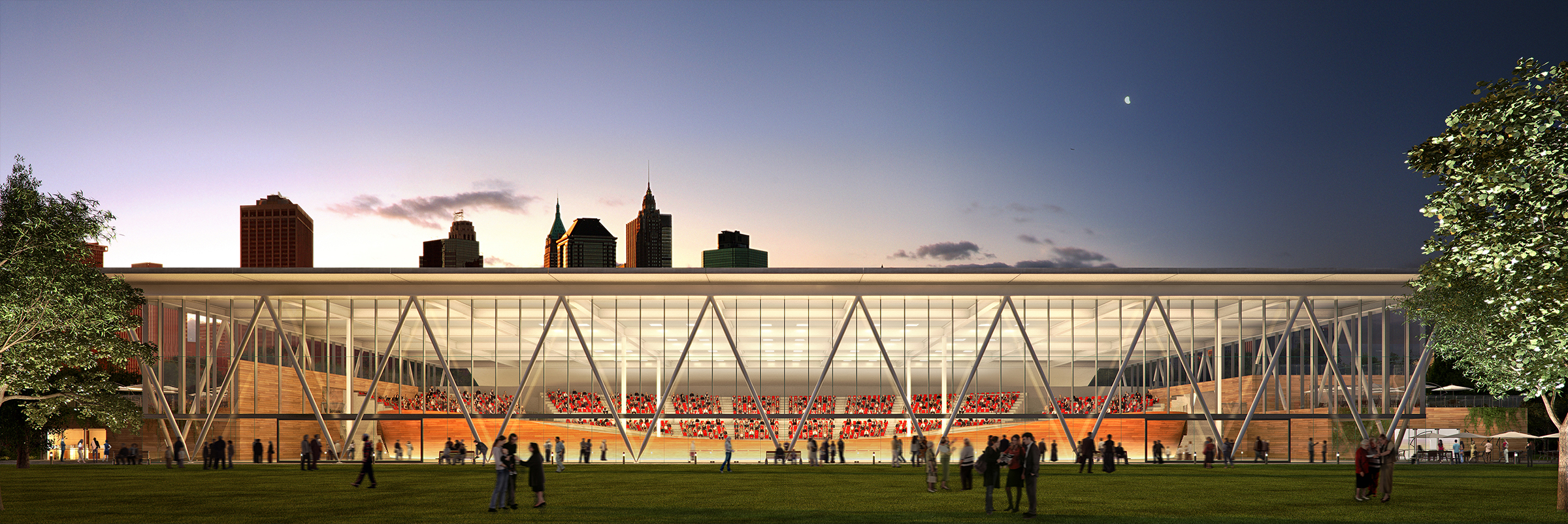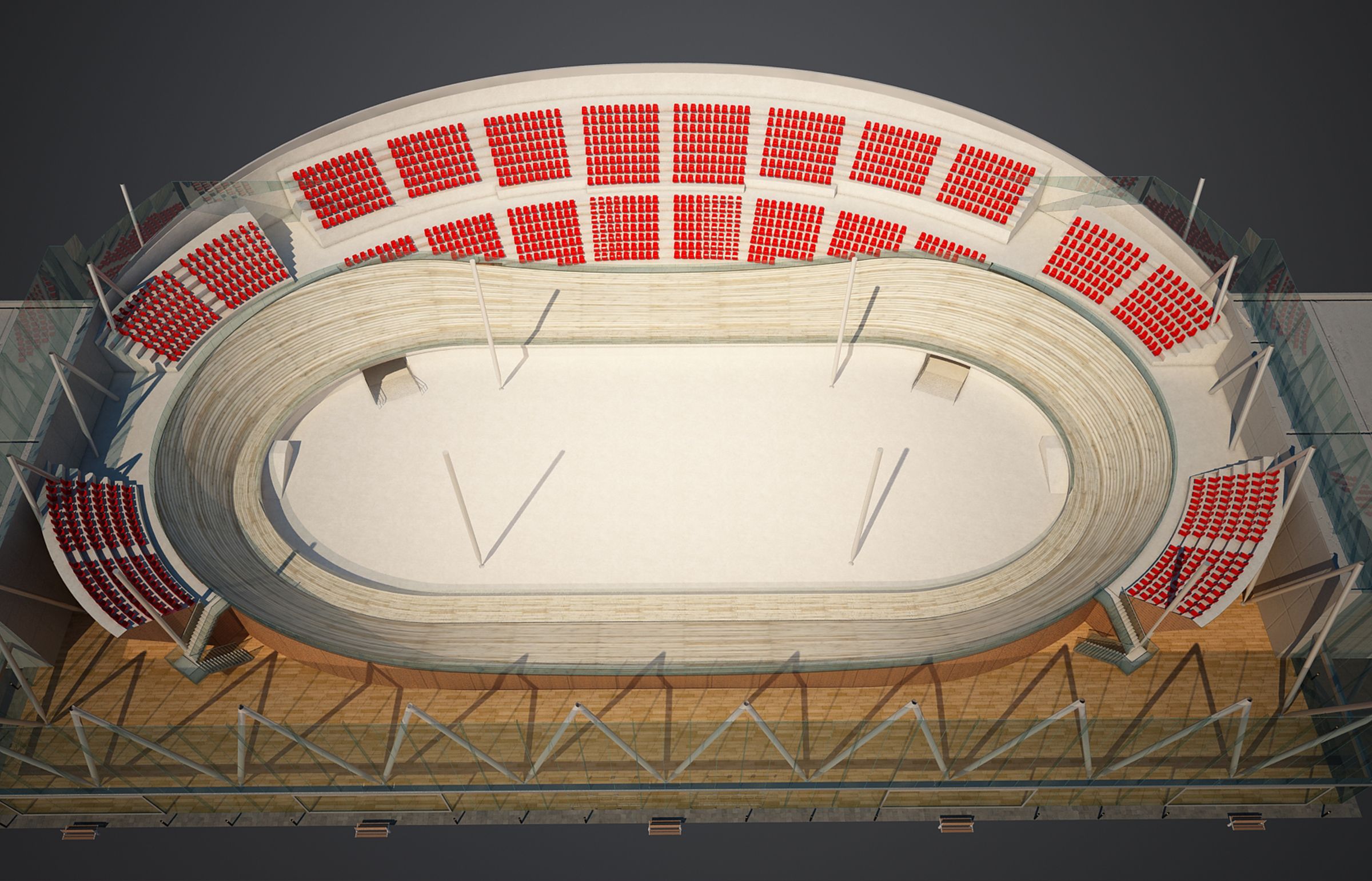 VoNYC Inc. — a privately funded nonprofit promoting track cycling in New York City — commissioned a design concept and feasibility study for this 3,000-seat, 110,000-square-foot multiuse building, which combines athletic facilities with retail space, a café, community center, exhibition galleries, public art, offices, locker rooms and pre-function areas. Designed for a variety of cycling competitions, the Velodrome’s 200-meter track surrounds a 22,000-square-foot infield that can be used for other sports, concerts, film screenings and conferences. A continuous glass curtain wall surrounds the track and seating areas, defining the space and allowing the public to look in and sports-spectators to gaze out. The wooden track and its structure sit like sculpture within this glass box, while a green roof with solar panels tops the building, designed to achieve LEED Gold certification.