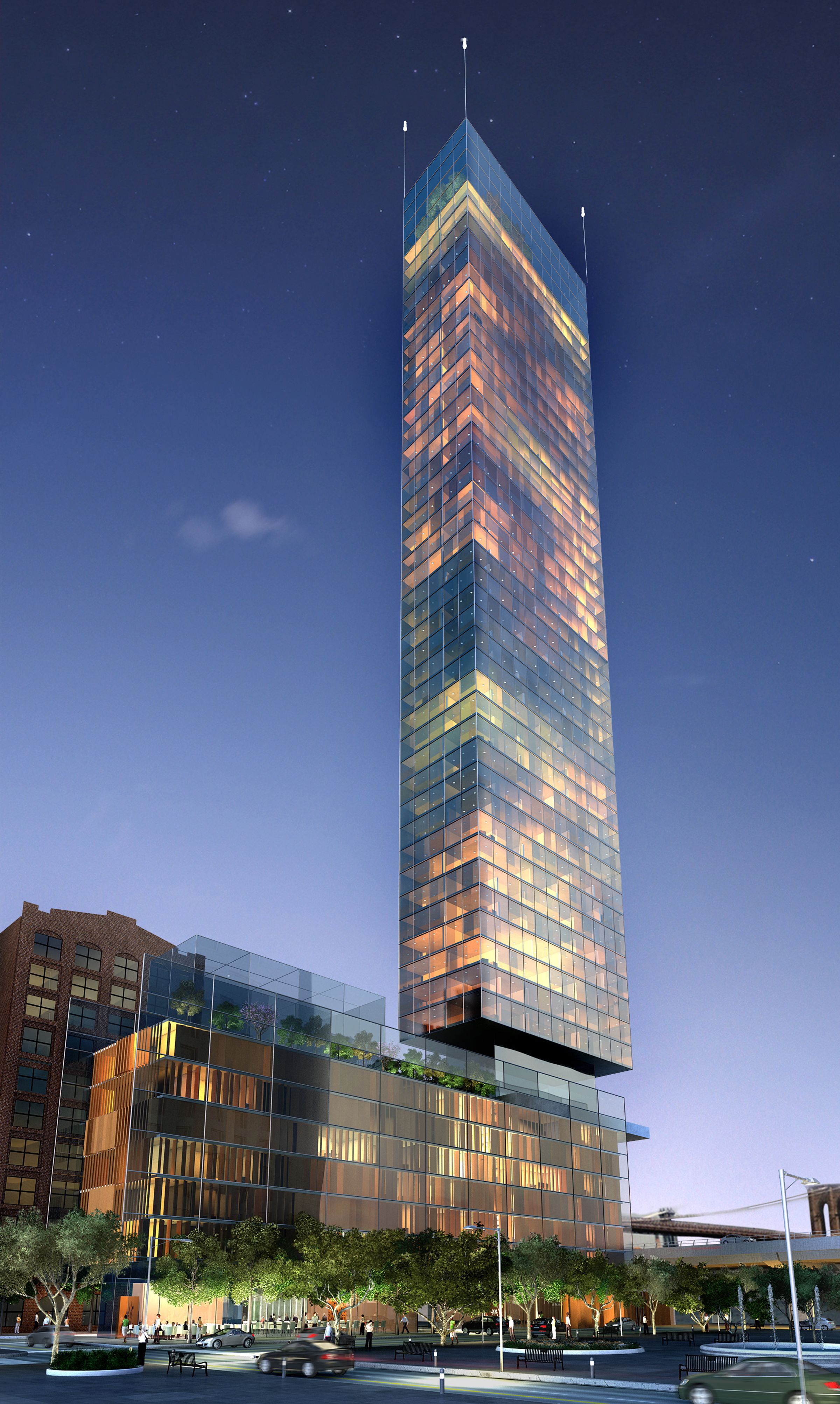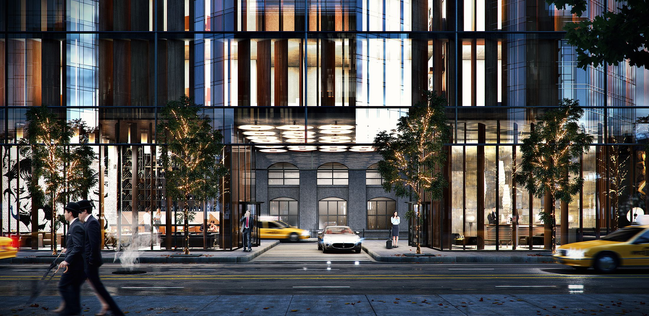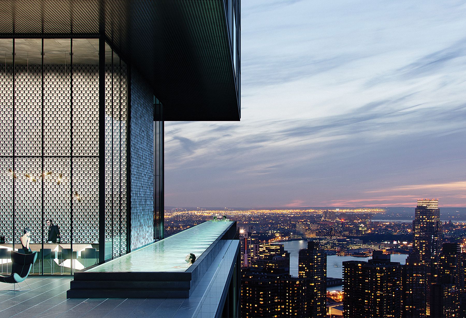 This mixed-use project near Lower Manhattan’s historic South Street Seaport comprises a 50-story condominium tower and a six-floor base structure housing a five-star hotel. Creating an intimate, luxurious arrival experience, a unique porte-cochère allows guests and residents to drive through the building, removing them from street and pedestrian traffic. From the porte-cochère, the condominium lobby sits to the east and the hotel’s lobby, restaurant and bar to the west, all with 20-foot-high ceilings and façades sheathed in glass. Atop the hotel, a landscaped terrace includes a gym, a yoga studio and a lap pool perched on the building’s edge, overlooking the Brooklyn Bridge, while the tower’s rooftop features a swimming pool enclosed by a 20-foot-high glass wind screen. The condominiums’ loft-like floor plans emphasize expansive river and harbor views.