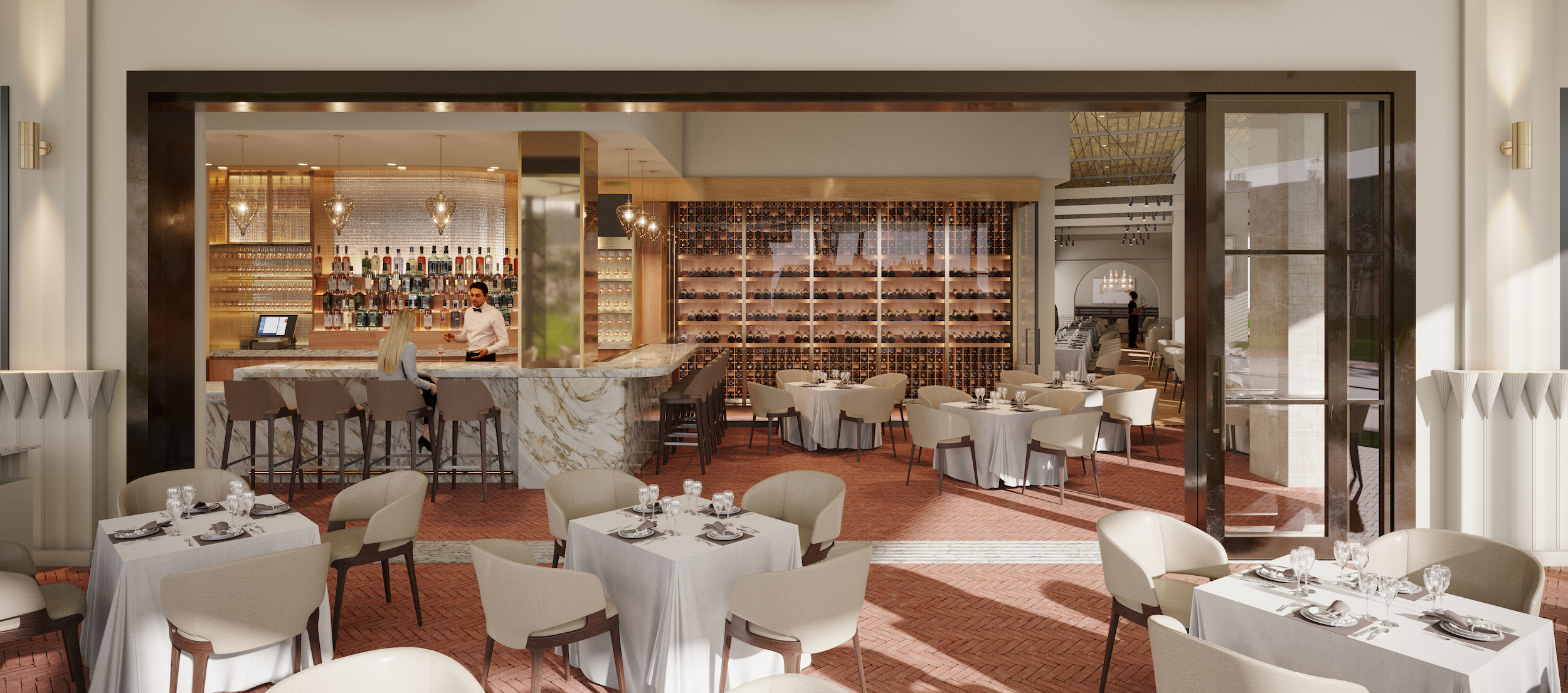 Trattoria Amici in The Americana at Brand lifestyle center in Glendale, CA is the latest restaurant designed by JS for development group Caruso and restauranteur Tancredi Deluca. Looking to provide more daylight and airiness to the interior, and to reinforce the connection between patio and bar, JS enlarged the existing exterior doorways by introducing a series of large sliding glass panels, creating a seamless flow from inside to outside. The interior restaurant and bar areas were refreshed with oak wood floors in a herringbone pattern, and soft cream tones.
