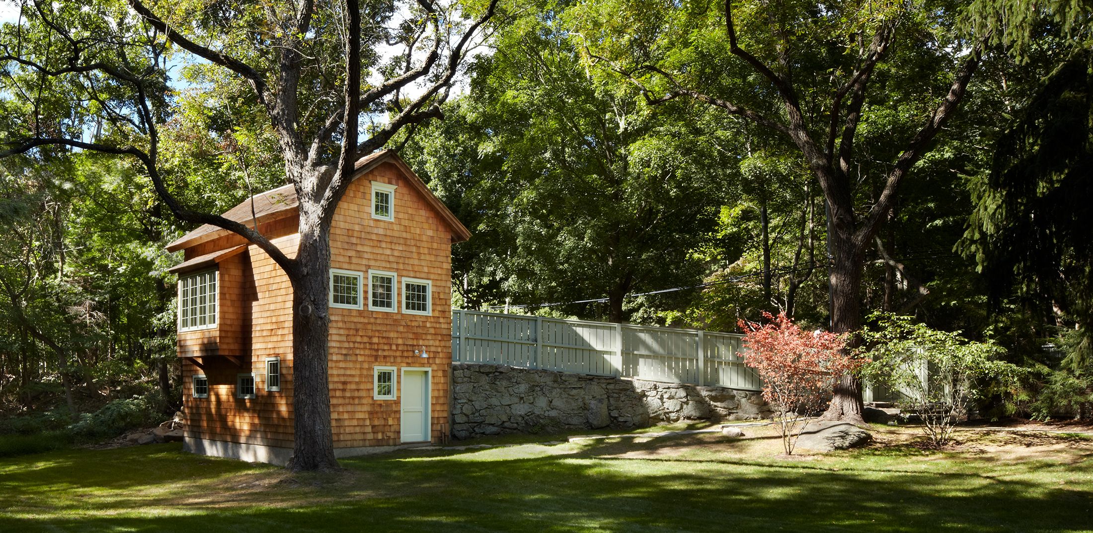 Making new from old, this adaptive reuse project on an estate in the suburban New York village of Bedford converted a historic barn into a rustic-but-refined 800-square-foot guesthouse. The dilapidated barn needed complete reconstruction, and the village required it to be rebuilt in its original form. To meet this challenge, the structure was painstakingly measured, then disassembled and rebuilt to carefully maintain its quirky slopes and mismatched corners. Finished with wood shingles, the barn will weather to its original silver-gray color. The two-story interior fills two functions, the upper level serving as a media room for weekend movie viewing, the lower containing guest entry, bedroom and bath. Inside, the mix of reclaimed materials includes a ceiling clad in wood repurposed from the historic structure.