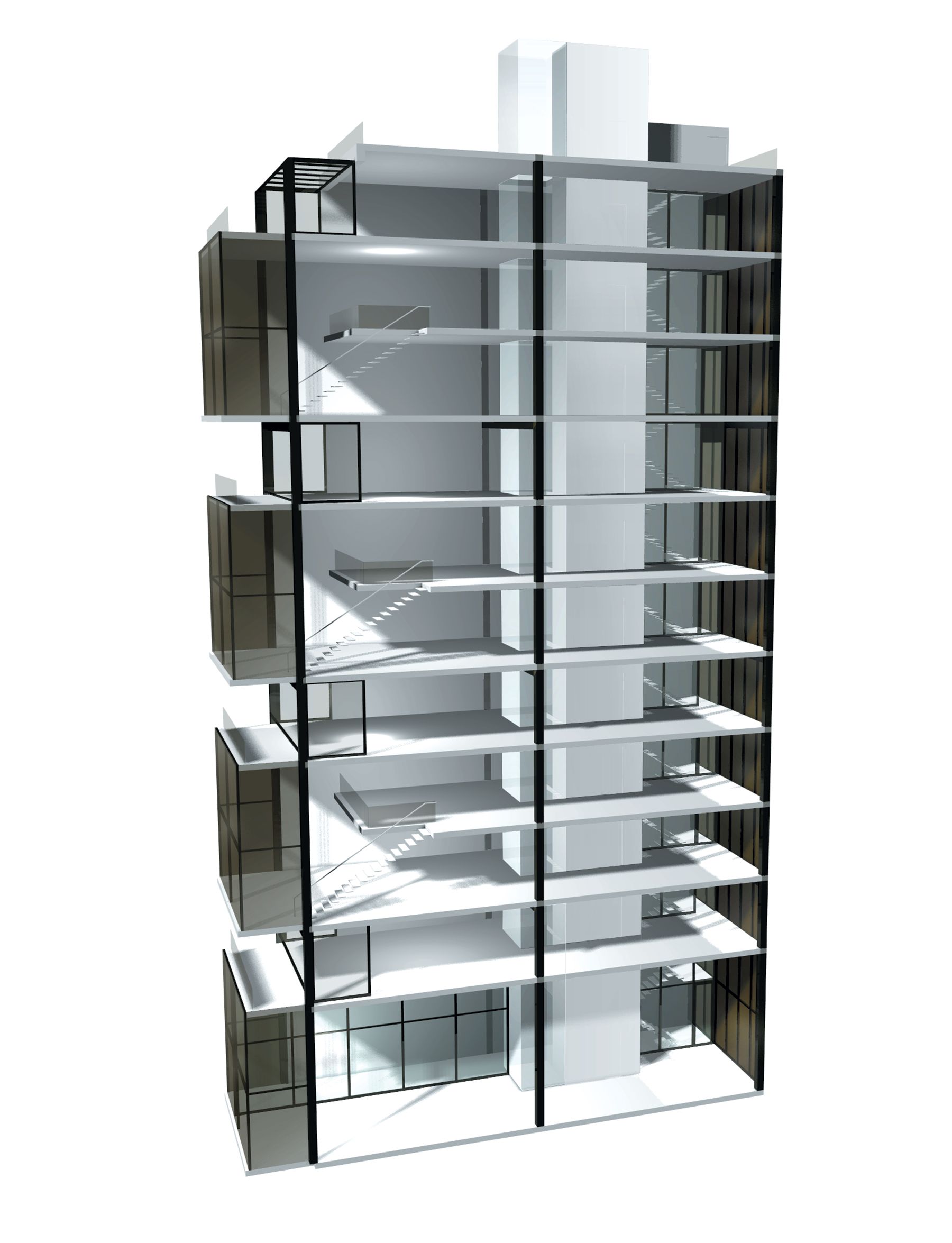 This mixed-use, luxury residential-and-retail project, which rises mid-block between Sixth and Seventh Avenues in New York’s Flatiron District, evokes the warmth and clean lines of Isamu Nagouchi’s 1950s Akari light sculptures. It juxtaposes a two-story retail base and duplex condominium apartments above, both sheathed in bronze-toned glass, with one-level condo units that each have a terrace and a recessed clear-glass wall. By alternating the double-height apartments with those of a single story, a series of lantern-like illuminated stacked cubes emerges. Inside, the loft-like apartments’ clean, open plans allow for easy flow from front to back, with a large, double-height space in each duplex facing the street. Residents share a ground-level garden and a rooftop terrace.