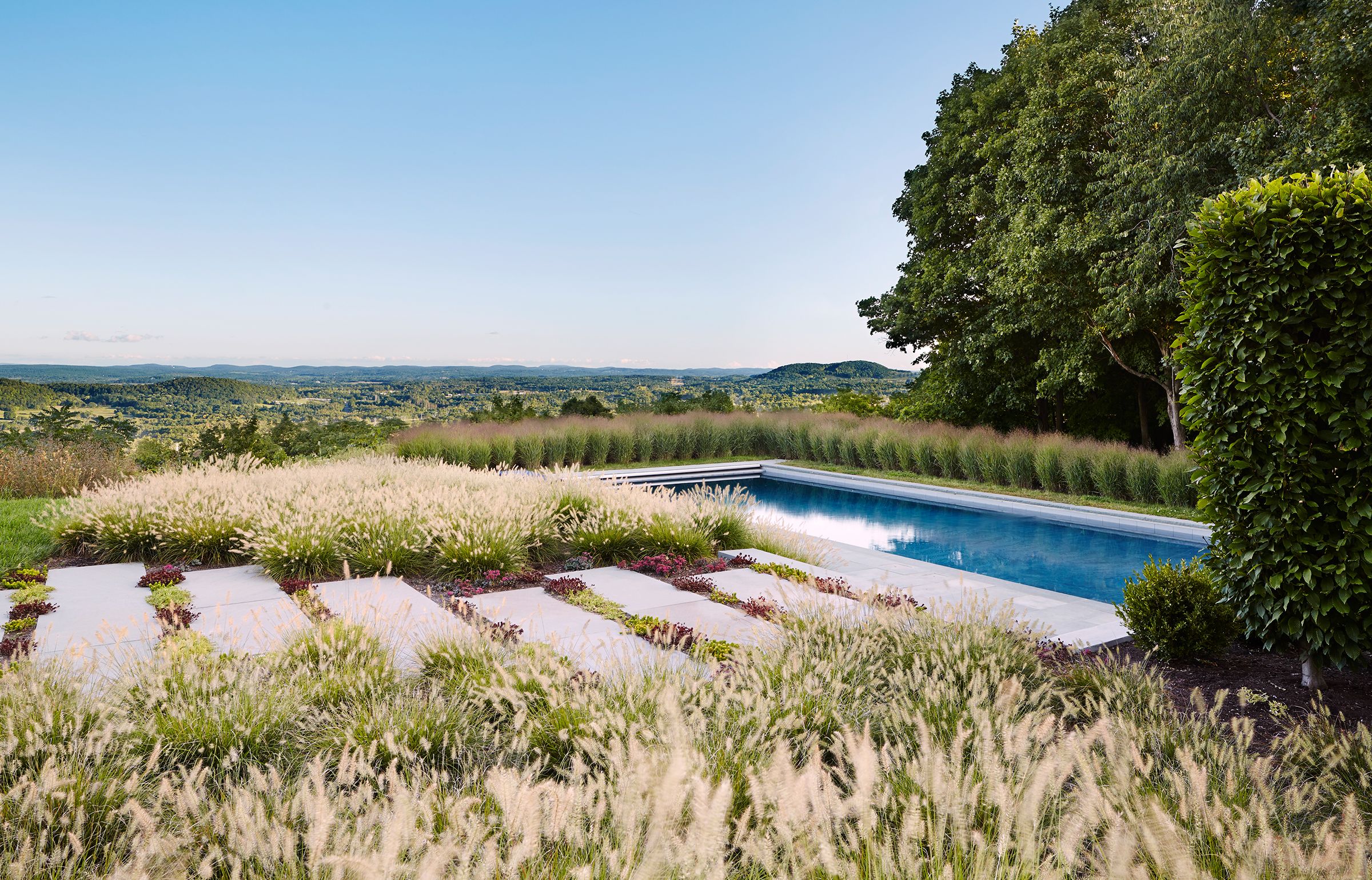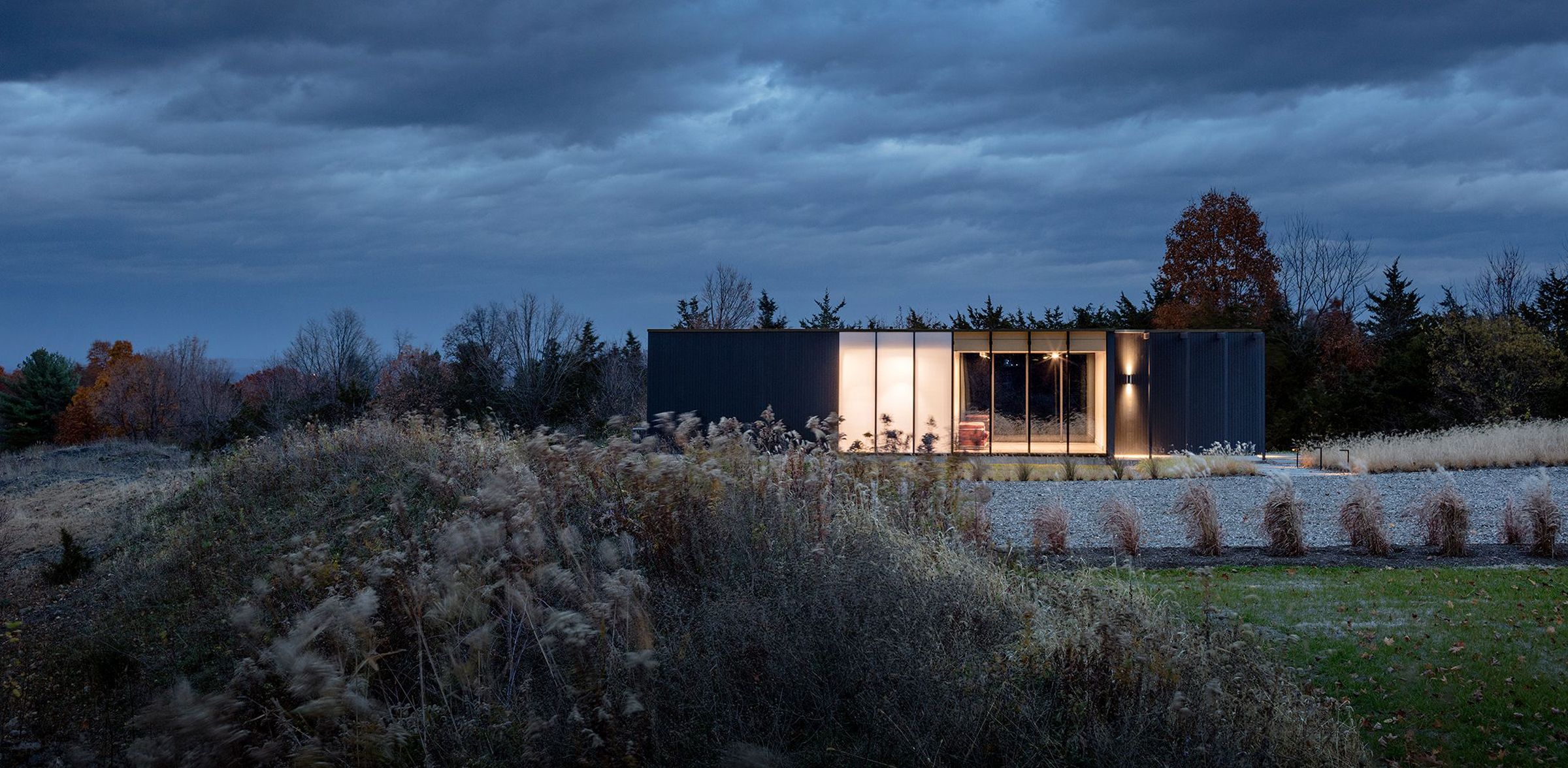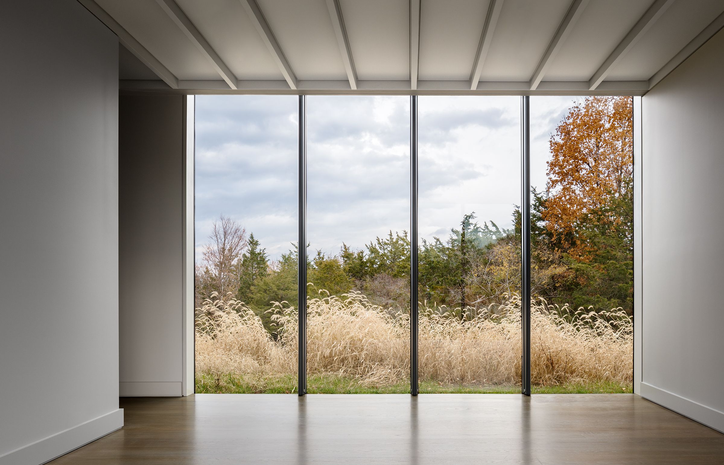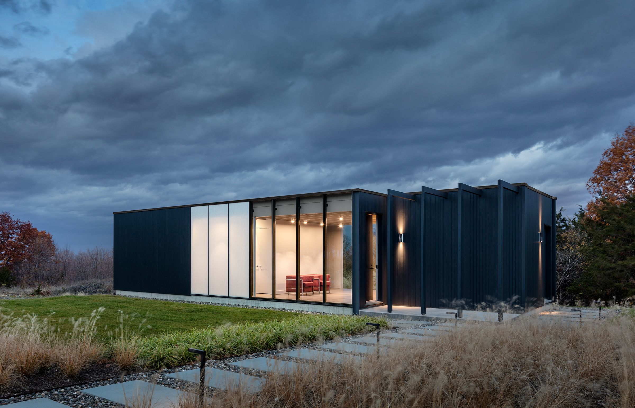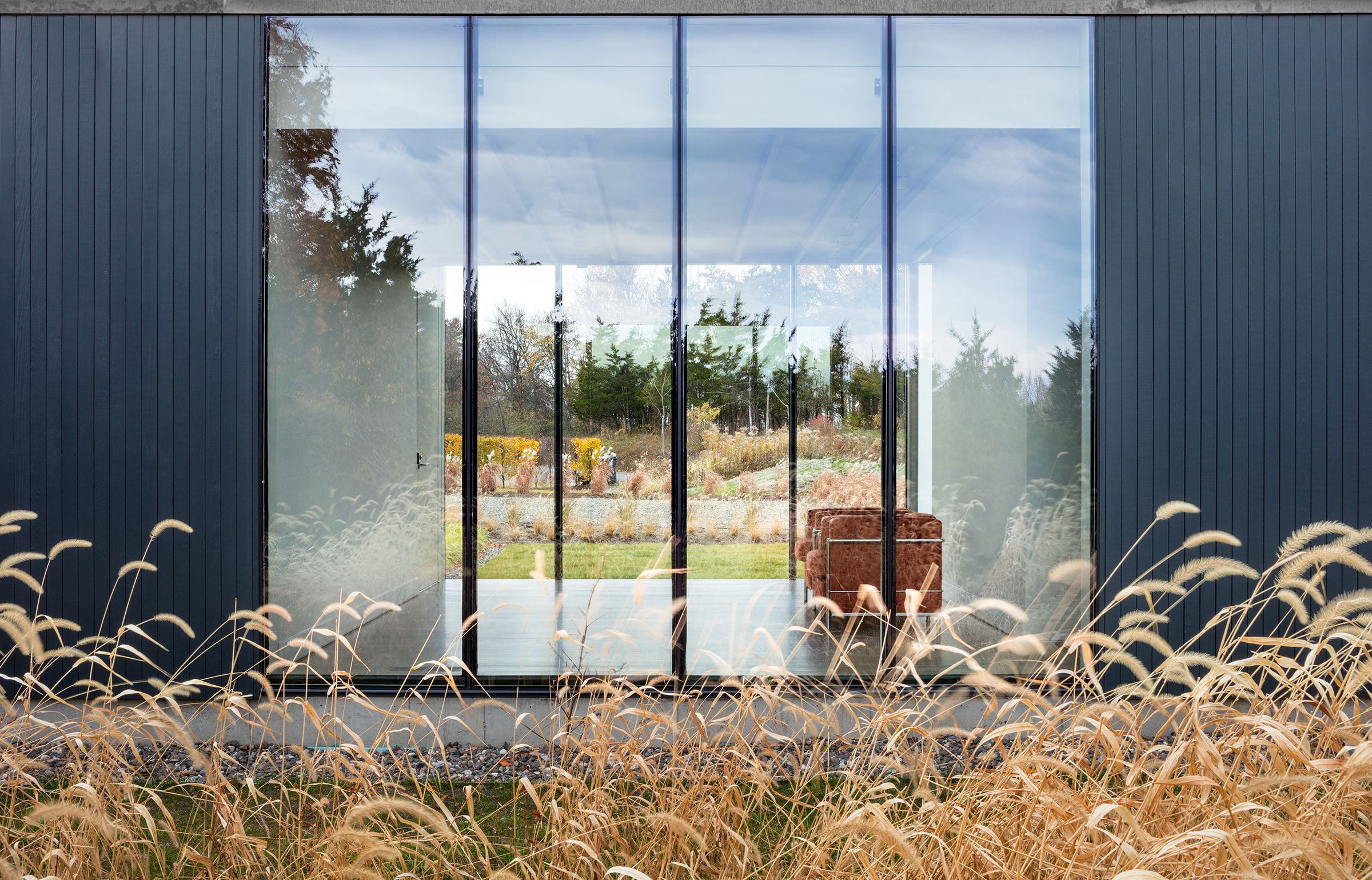 The master plan for this four-acre hillside site outside of the Upstate New York town of Hudson includes a new guesthouse and pool adjacent to an existing contemporary home. The 20-foot-by-45-foot pool takes advantage of the property’s Hudson Valley views, while the guesthouse, nearly surrounded by a new meadow, forms an entry court with the main structure. A covered breezeway divides the guesthouse into two sides, one a gym for the homeowners and guests, the other a living-and-sleeping area for guests. The opening acts as a bridge between the sides, allowing for privacy as well as connection to the surrounding landscape. Clad in vertical wooden slats, the structure’s simple construction, including exposed rafters and concrete flooring, features an elegant glass wall that maximizes the building’s transparency and views.