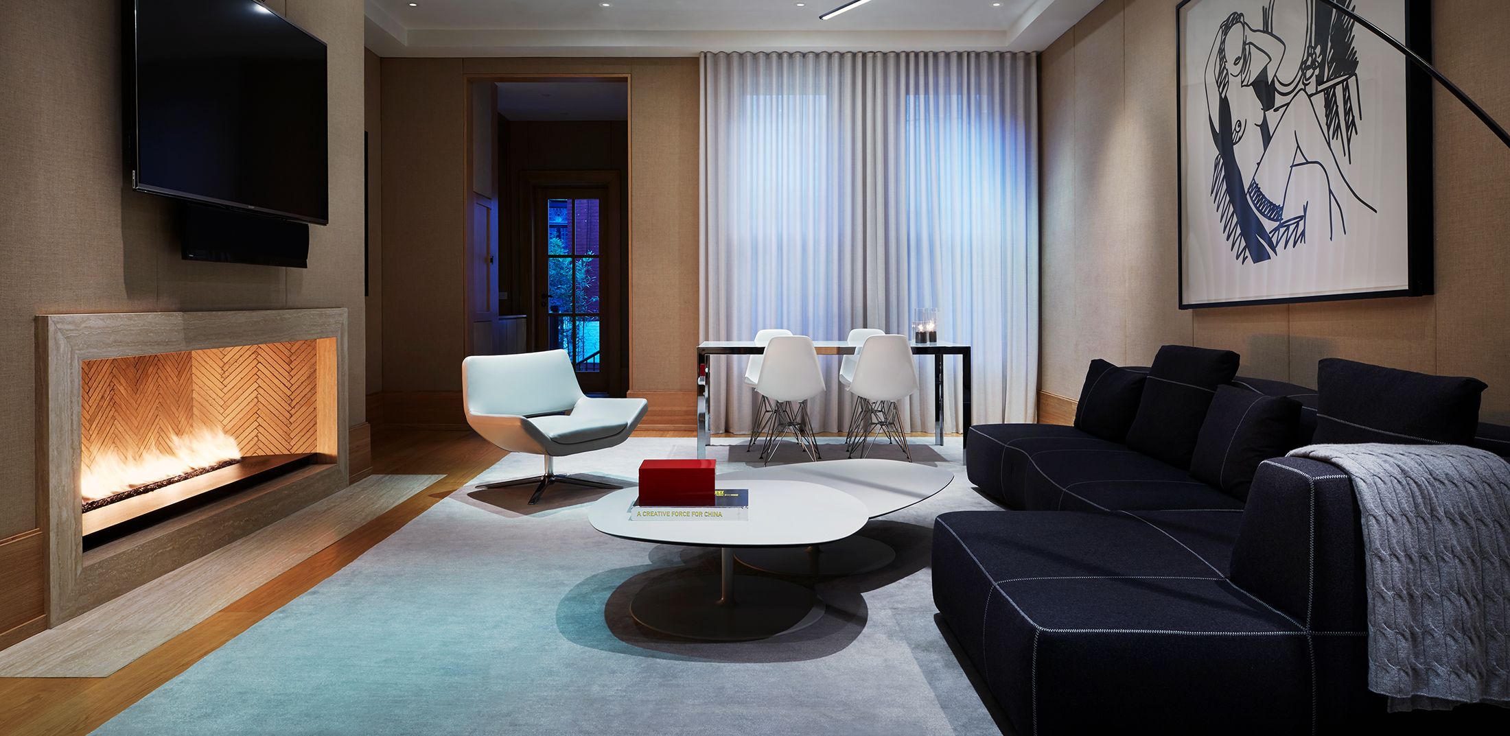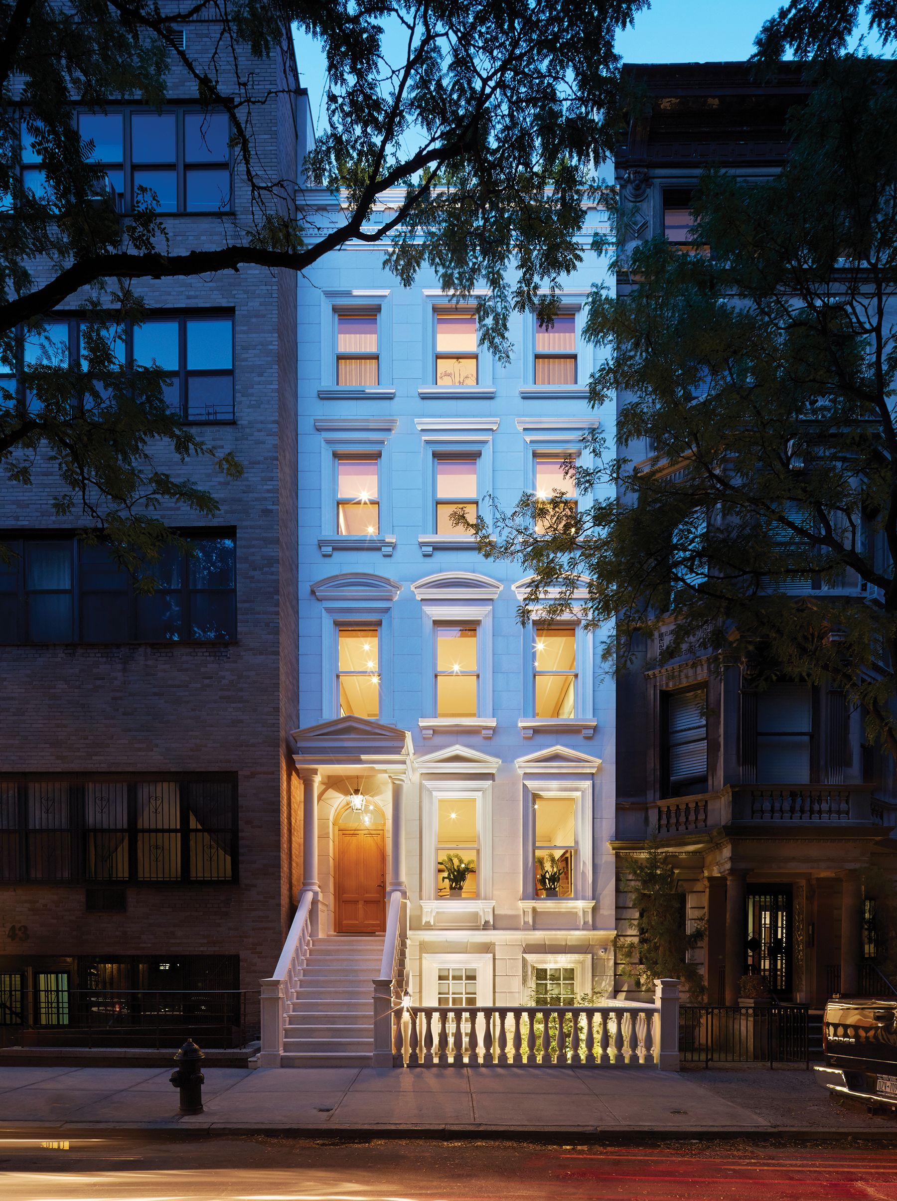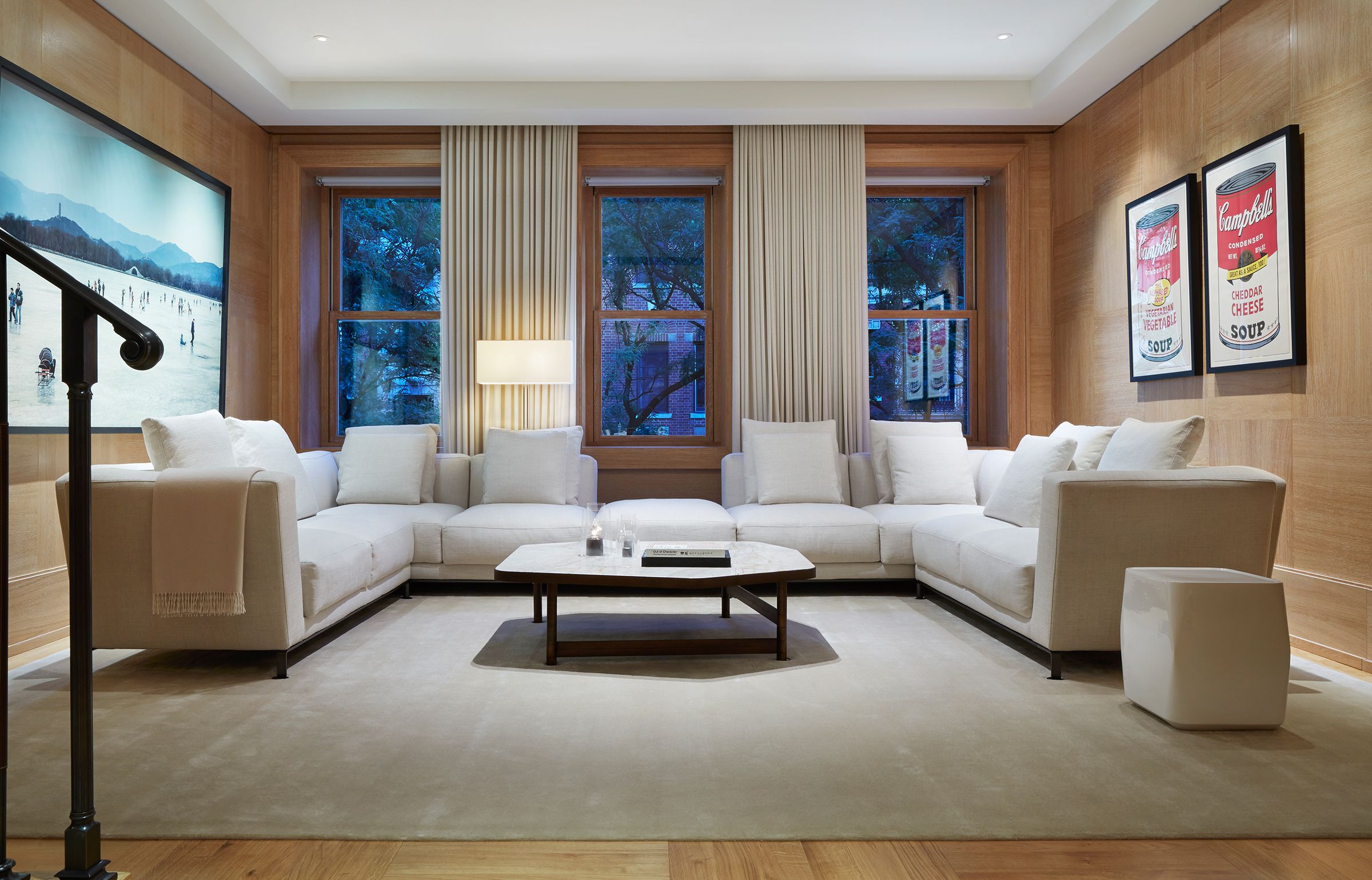 The sweeping scope of this seven-story townhouse project on Manhattan’s Upper East Side comprises six bedrooms; living, dining and kitchen areas; a gym; and a subterranean indoor swimming pool, as well as a backyard and roof terrace. The homeowners purchased the historic building after its renovation and then commissioned custom interiors. Existing Italian-oak paneling set the stage for a selection of modern furniture carefully placed throughout the 9,000-square-foot house. Sheer draperies and muted fabrics bring a sense of calm quietude and serenity to the interiors, as does the spare quality of the overall scheme, which allows the clients’ art collection — including works by Andy Warhol and Thomas Struth — to take center stage.