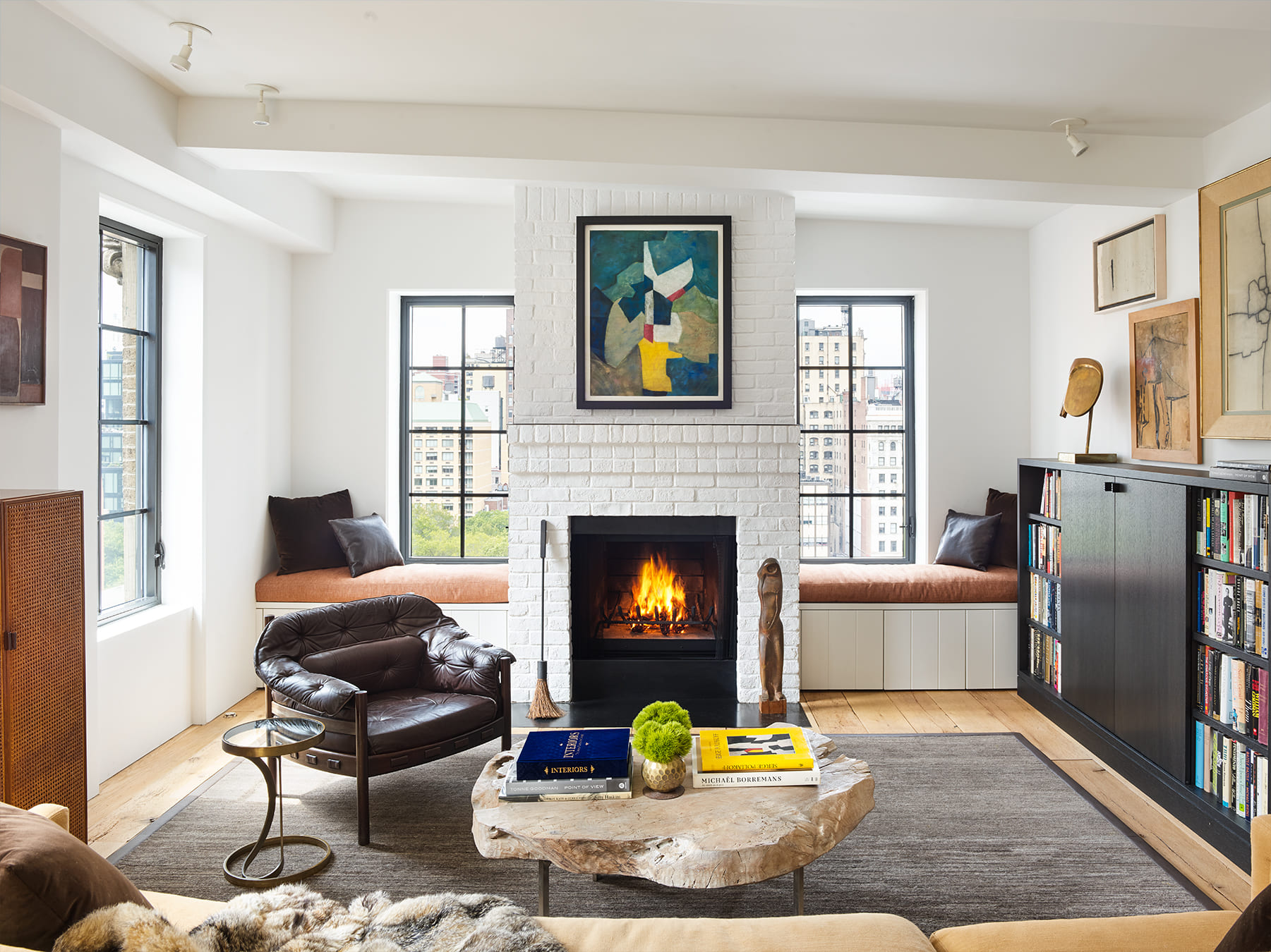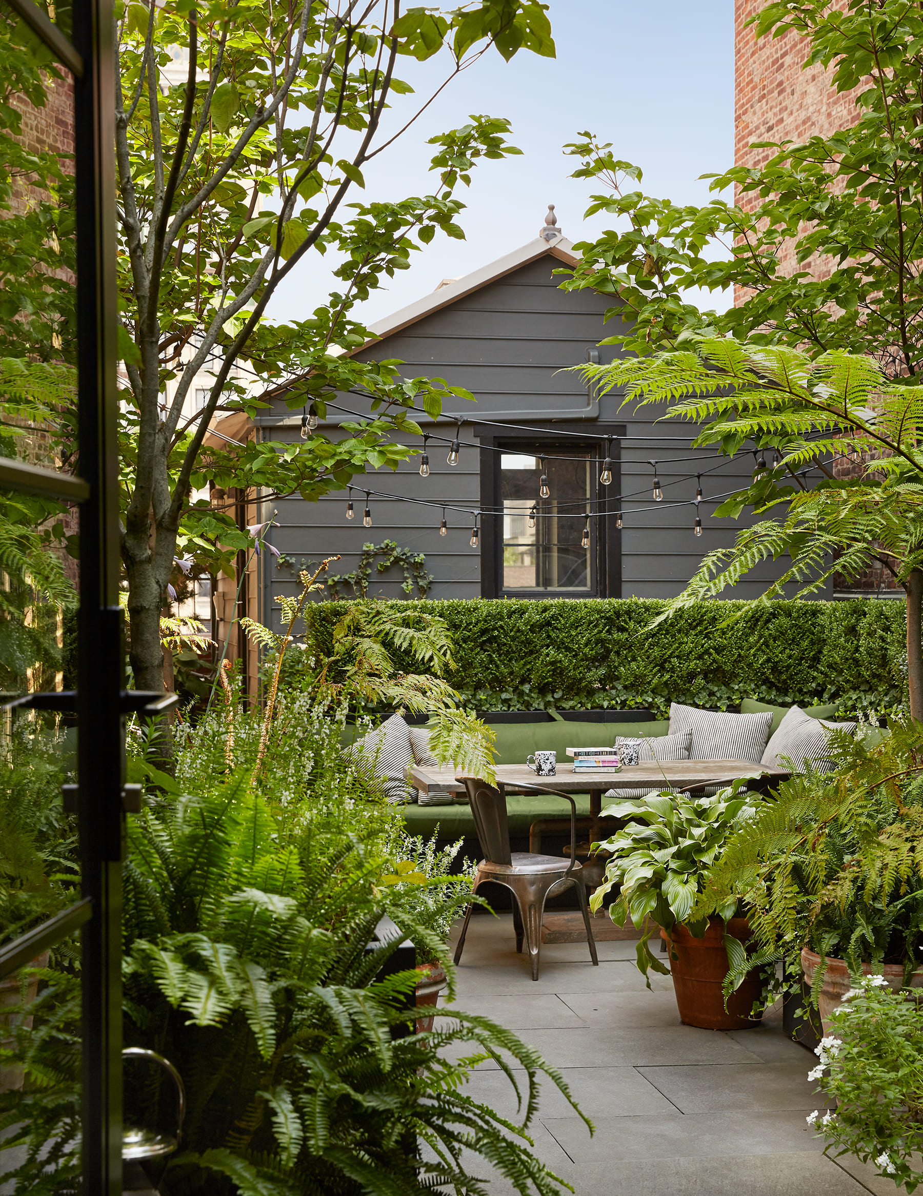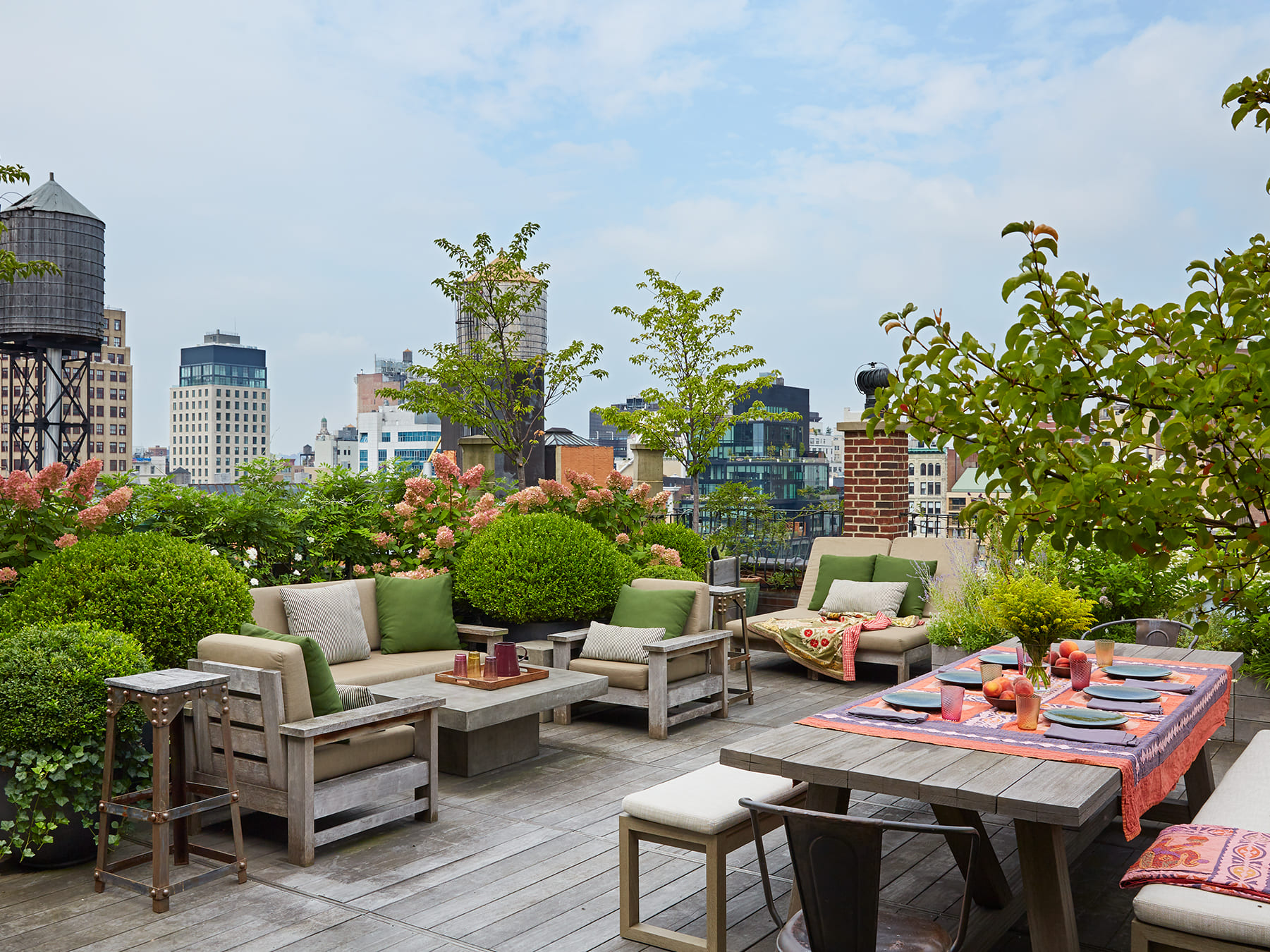 This unique New York penthouse is composed of two separate structures on two levels of a converted 19thC industrial building rooftop, creating a charming oasis in the sky. On one level, a lush, green courtyard separates the main living space from a private study that can also serve as a guest cottage. One level up, a large terrace with 180 degree skyline views is the quintessential New York rooftop entertaining space, complete with an outdoor cinema.