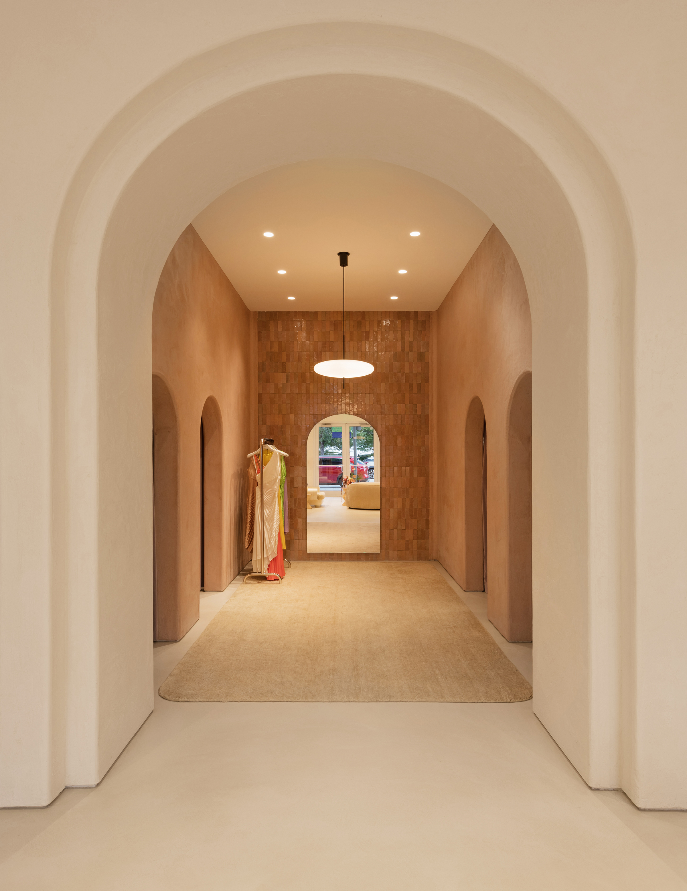 A.L.C. Miami is the latest location designed by janson scuro for fashion brand A.L.C. Located in Miami’s Design District, the store retains the brand’s signature sinuous curves, arches and textured plaster walls while adding hand-crafted Moroccan tile and velvet drapery in soft rose tones. Over-scaled armchairs in lacquered vellum and a white boucle curved sofa add to the luxurious residential feel.