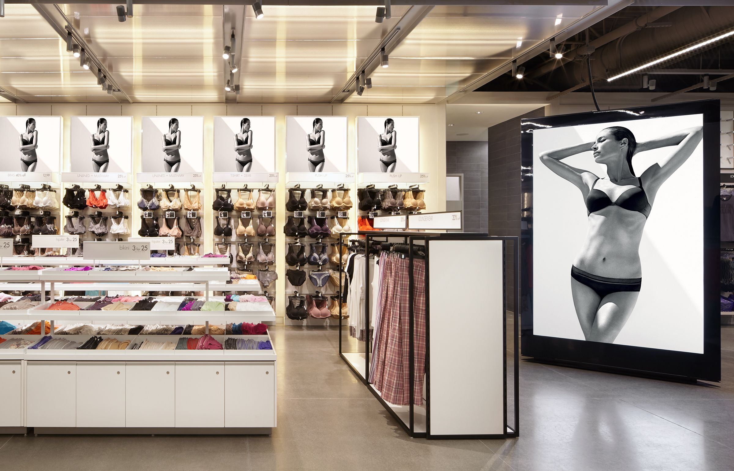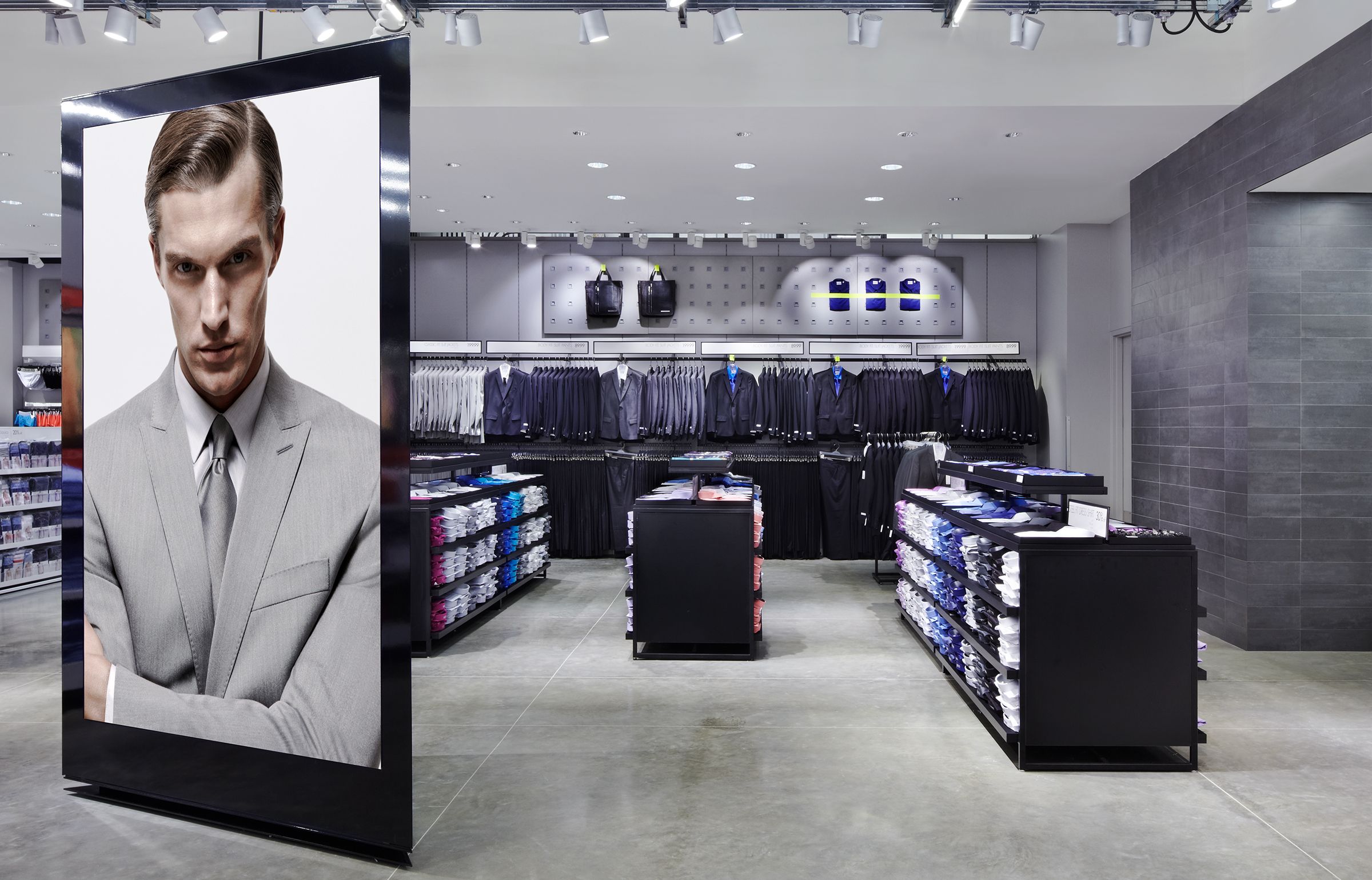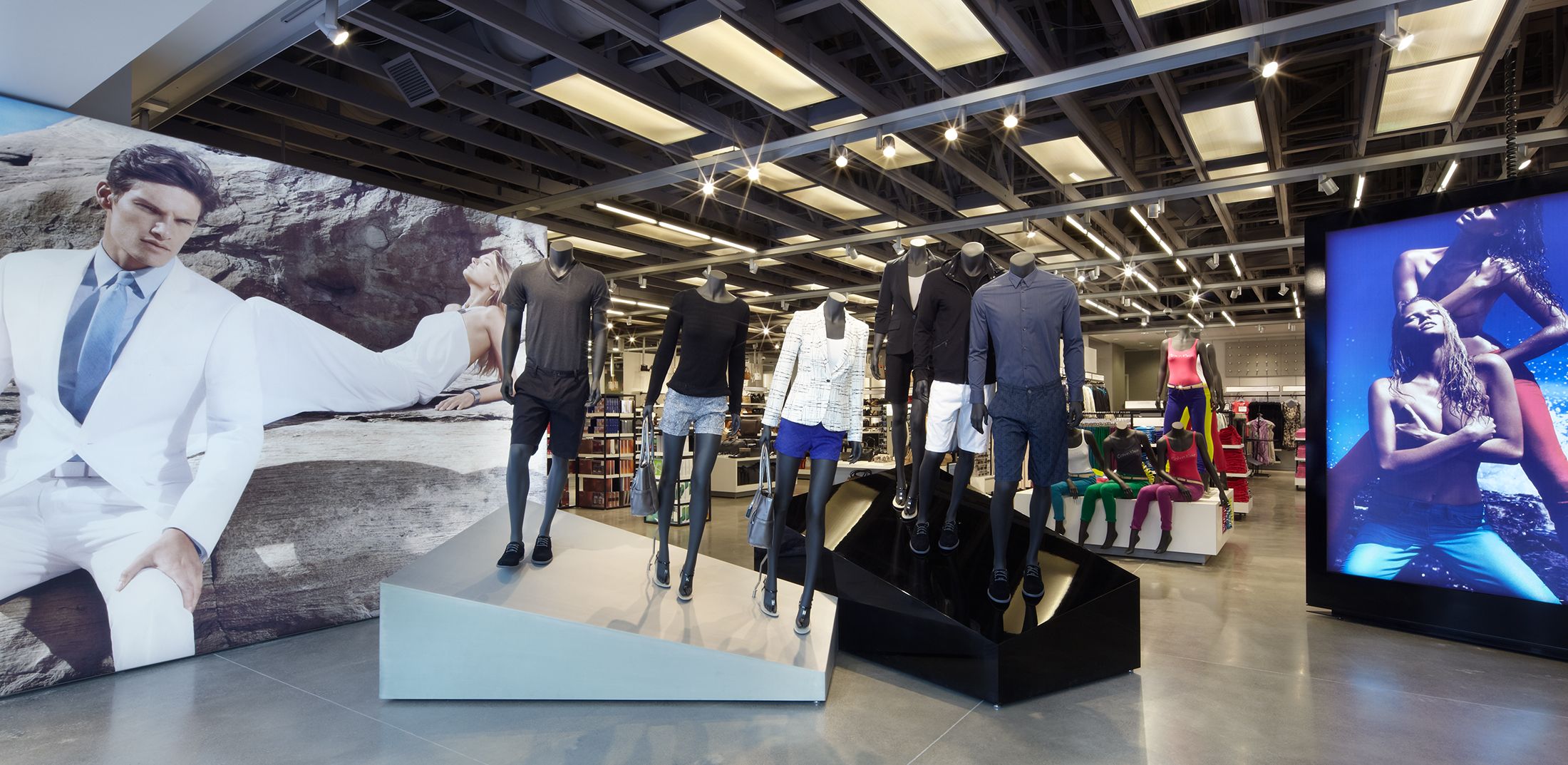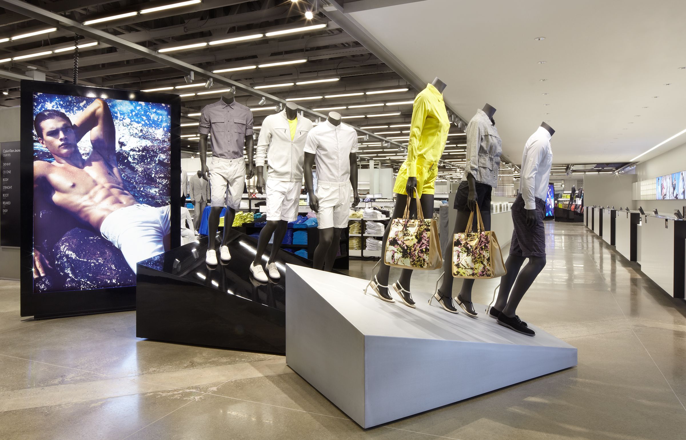 Each approximately 20,000 square feet in size and designed as high-volume, high-energy environments, these company stores represent Calvin Klein in the highly competitive off-price market. The spaces combine men’s and women’s clothing, previously sold in separate storefronts, as well as footwear and accessories. The new stores make ample use of Calvin Klein’s graphic and advertising materials as iconic brand touchstones, their schemes incorporating open ceilings and concrete floors, as well as exposed HVAC and lighting systems. These elements both address the budget considerations inherent in this typology and become emblems of a loft-like, sophisticated atmosphere that appeals to the younger demographic these stores target and serve.
