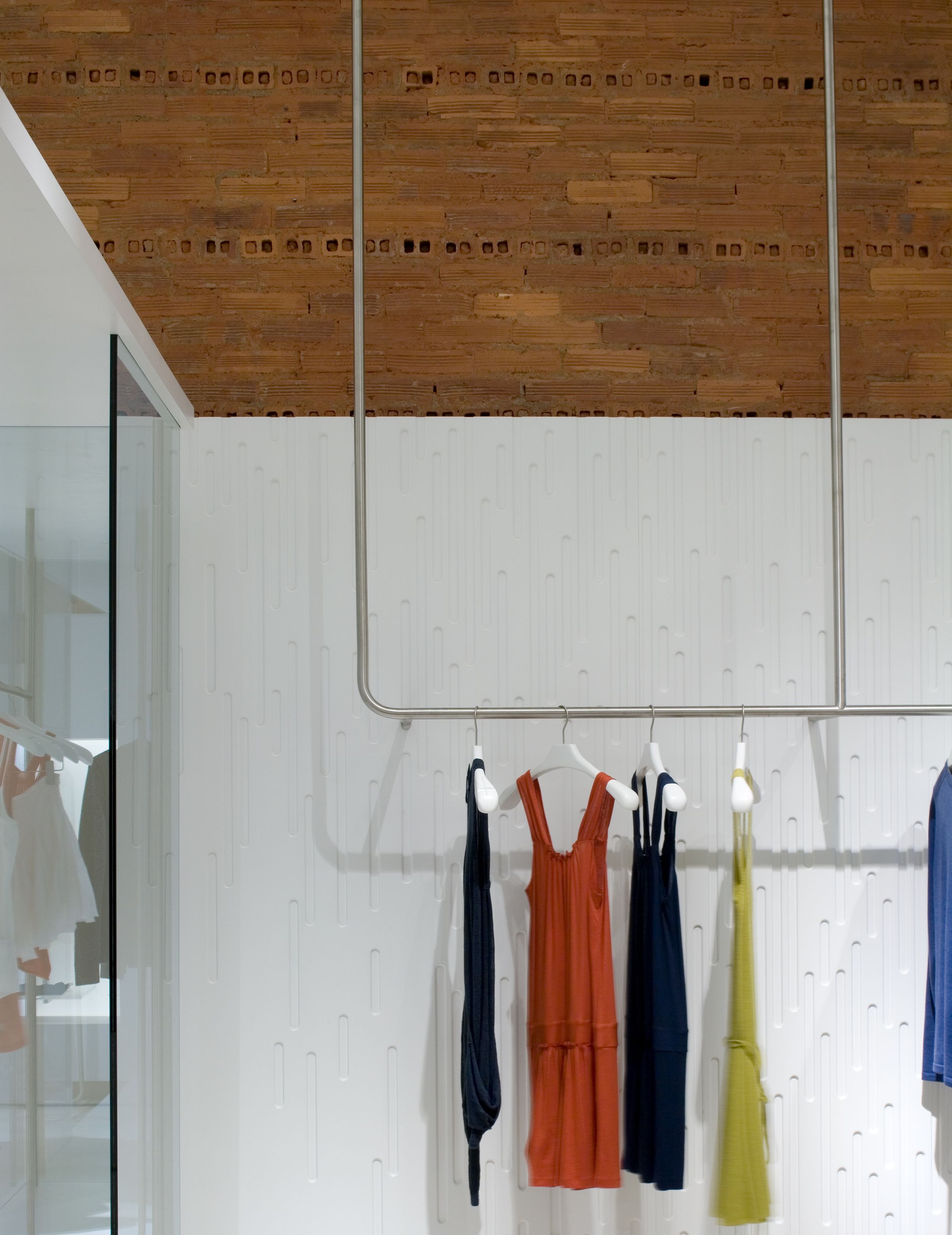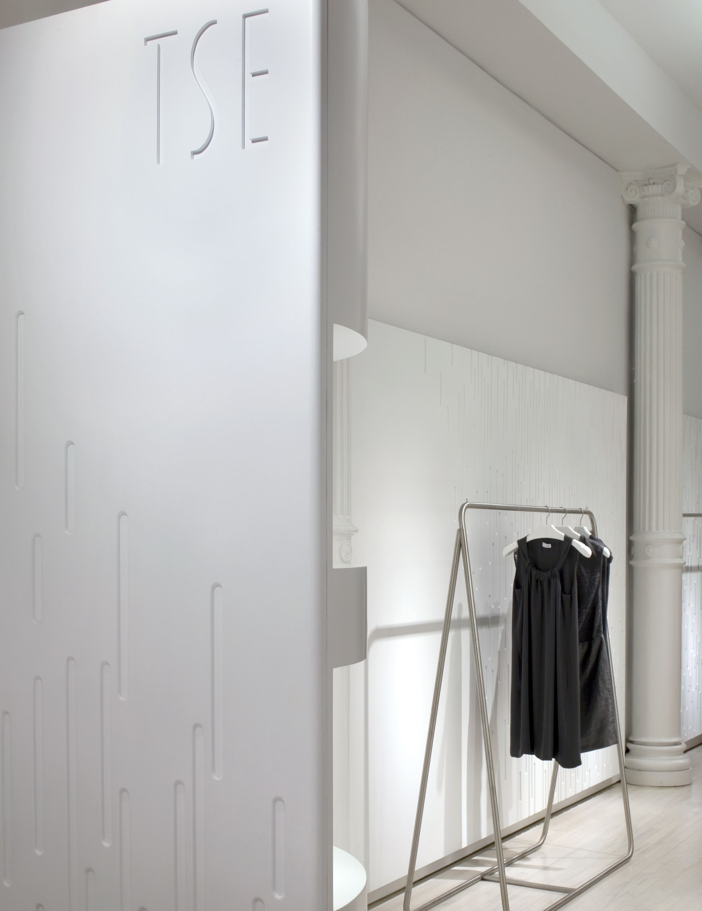 The design for this downtown Manhattan outlet of the high-fashion cashmere label TSE was born out of the aesthetic of a historic, quintessentially gritty Soho loft, now newly outfitted with modern, luxurious finishes. The boutique retains the brick walls, oak floors and exposed ductwork and piping of the original raw space, juxtaposing them with refined, highly lacquered, soft-white wall panels whose curving shape creates a ribbon effect throughout the store. The smooth finishes of these panels both contrast with and complement the rich, intricate textures of the cashmere. Lightweight display fixtures — made of gently arched, satin-finished stainless-steel bars — hang from the ceiling or stand in front of walls, giving the sense that the clothing is floating above the floor or in front of the lacquered panels, rather than simply hanging.